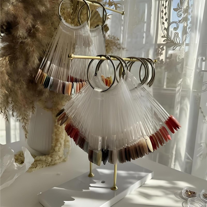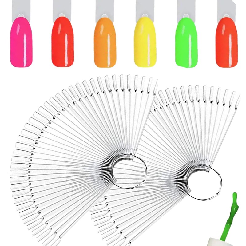 - 【Perfect size for versatile application】Each nail sample is approximately 12.2cm/4.8 inch long and 1cm/0.4inch wide.100PCS clear fan-shaped display sticks packaged with 2 metal nail display rings