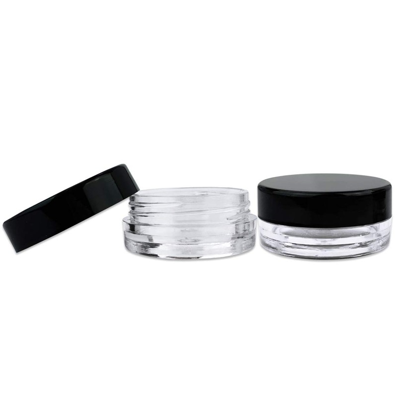 - 3g/3mL Round Jars | Quantity: 100 pieces | Base Color: Clear Lid: Black | Size Measurement: 1.2 inches | Height: 0.5 inches