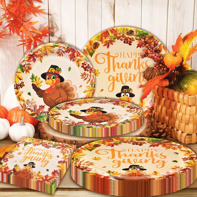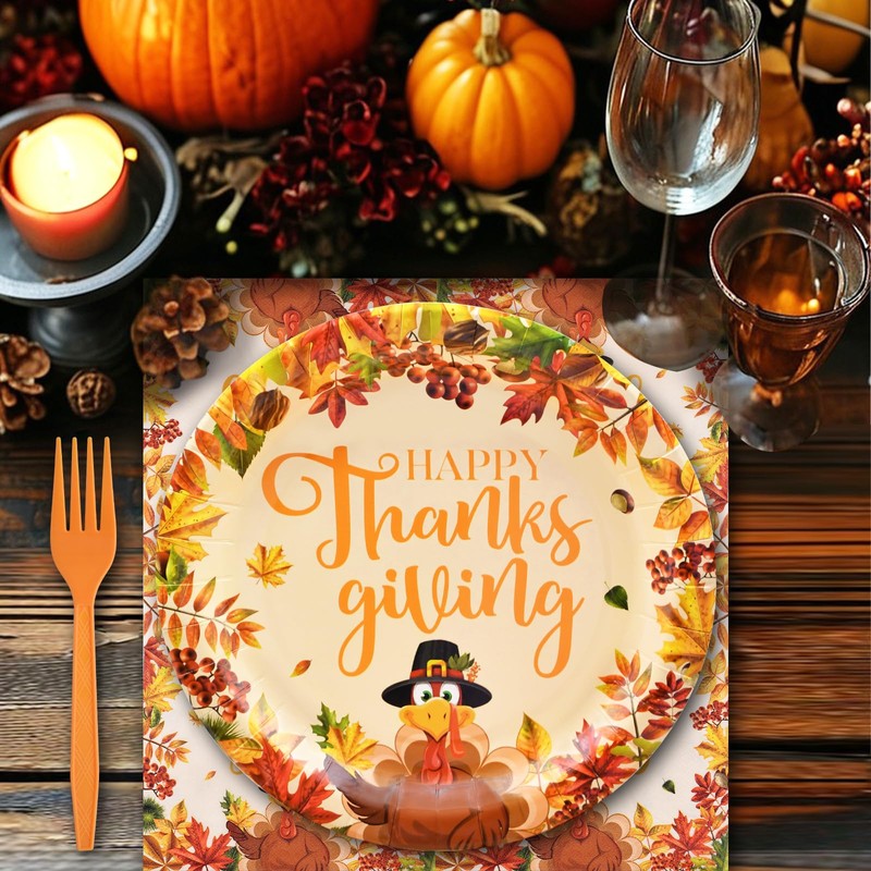 - Happy Thanksgiving Turkey Design –Featuring cute cartoon turkeys surrounded by colorful autumn leaves, this tableware set brings a festive, warm atmosphere to your holiday gathering. The playful design is perfect for creating a welcoming Thanksgiving table that guests will love.