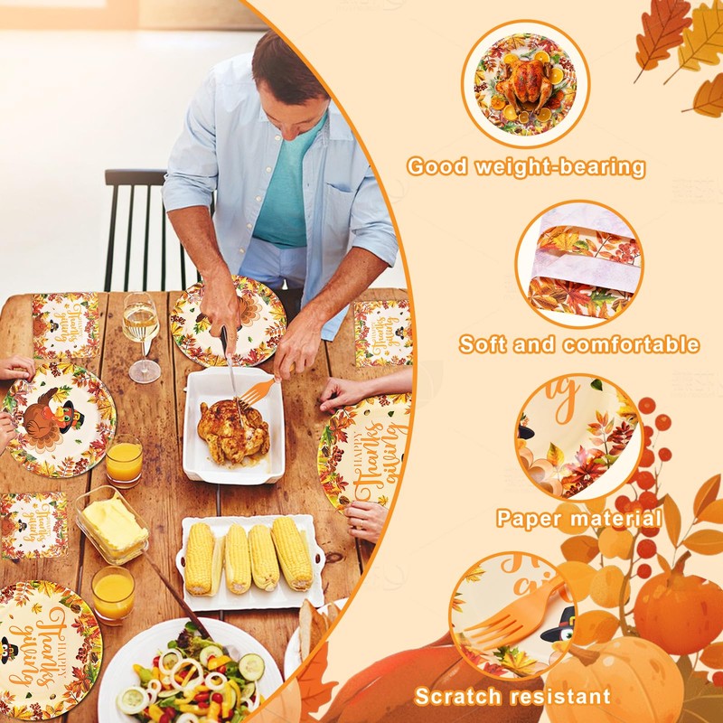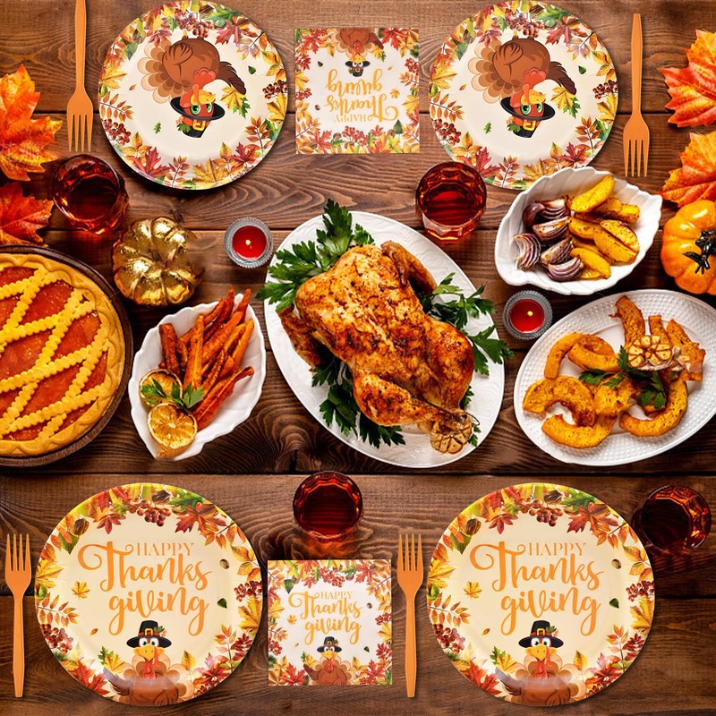 - High-Quality Tableware Set –Made from premium paper, the plates are designed to handle a variety of holiday foods without bending or leaking, while the plastic forks are strong enough for all your Thanksgiving dishes. This set combines practical use with a cheerful turkey design to perfectly complement your fall celebration.