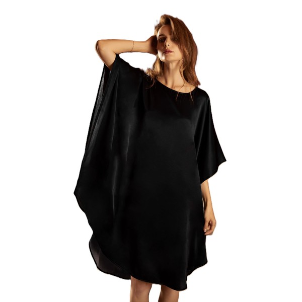 100% Pure Mulberry Silk Batwing Tunic Dress/Luxury Nightgown Plus Size 2-in-1 Design, Plus Size and Oversized Black