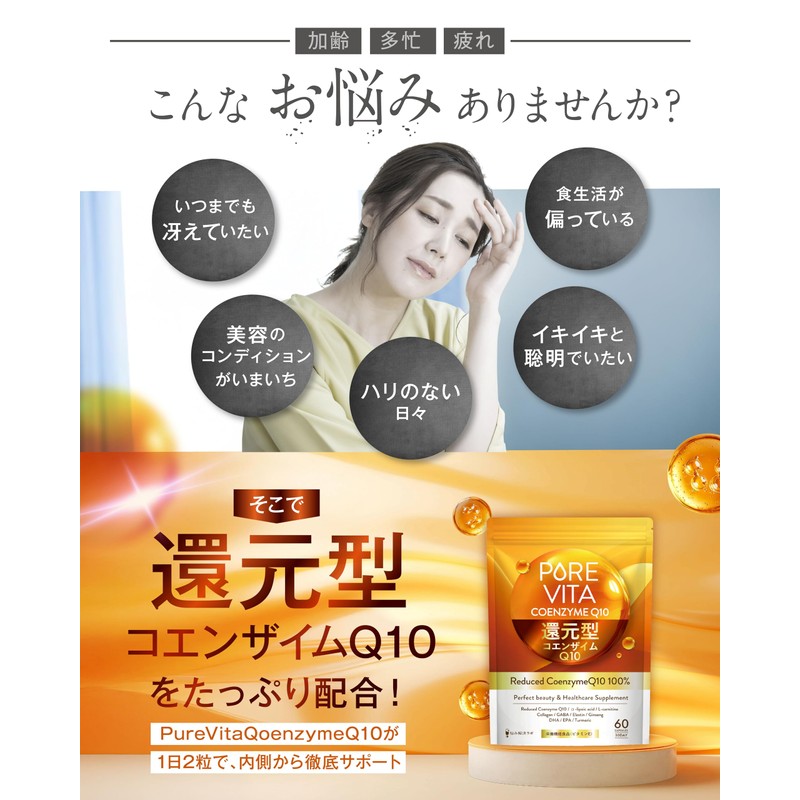 【高濃度100%還元型コエンザイムQ10】ピュアビタ 還元型 コエンザイムQ10 100% カネカ社製 30日分 アルファリポ酸 L-カルニチン 黒にんにく GABA 高麗人参 アスタキサンチン コラーゲン 国内製造 悩み解決ラボ