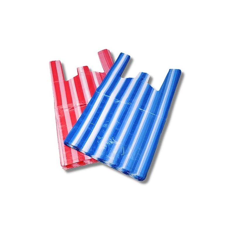 - DESIGN: Classic striped pattern carrier bags in red and blue colour options with convenient vest-style handles for easy carrying