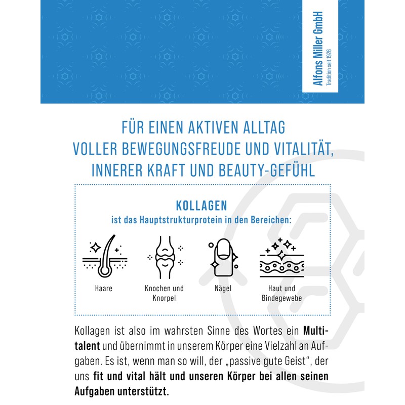 - PHYSIOLOGISCHE FUNKTION: Zum Aufbau und Erhalt von Bindegewebe und Gelenkknorpeln benötigt der Körper ständig eine Vielzahl von Grundstoffen, die über die Nahrung zugeführt werden müssen. Ein wichtiger Baustein hierbei kann das Hydrolysat des kollagenen Bindegewebes darstellen, wie es in Millers Alpha-Gel vorliegt.