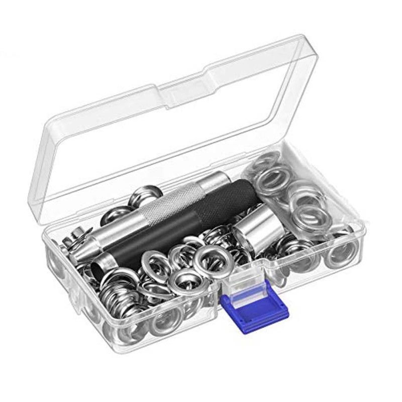 2. Grommet Kit: 100 sets of eyelets, a matching mandrel and 100 sets of grommets (each set includes 1 eyelet and 1 washer) and a storage box.