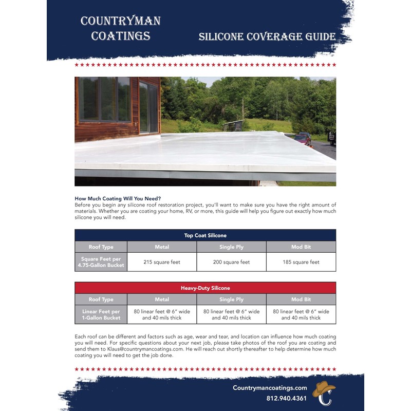 - Made in America – All Countryman Coatings Silicone Roof Coatings are made in America and are ready to ship to you on a moment’s notice. Apply your RV roof coating this weekend and have it watertight for your next trip.