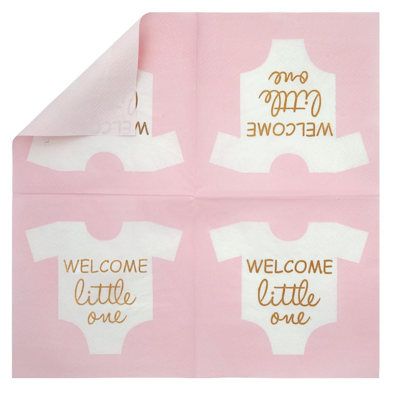 - Servilletas Welcome Little One: Las servilletas rosas cuentan con letras de color dorado que dice "Welcome Little One" dentro de un body blanco para bebé