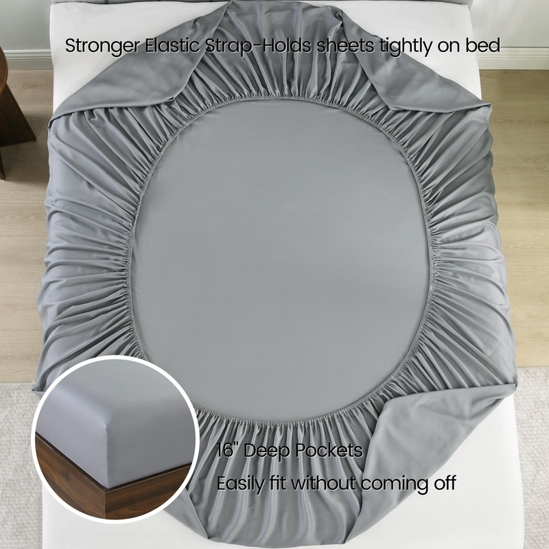 100% Viscose Derived from Bamboo Fitted Sheet Full Size Only, 16" Deep Pocket, Reinforced Elastic Band, Silky Soft, Breathable and Cooling Sheets, Silver Grey