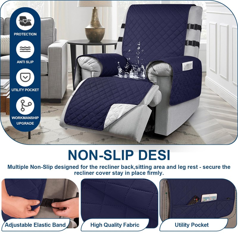 - Completely non-slip: this solid round colloid design on the back of our non-slip chair protector for relaxing chairs, each elastic band on the hips and foot part keeps the cover in place and does not slip. 4 straps and round gel to reduce the slipping of the chair cover even on leather furniture.
