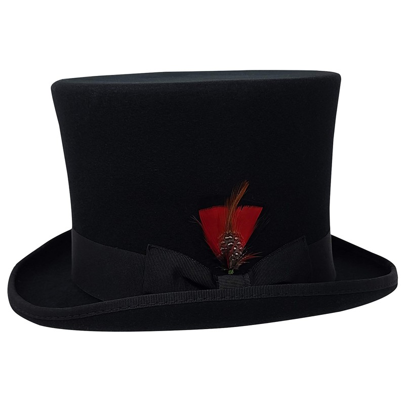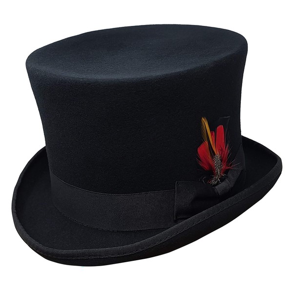 100% Wool Felt Top Hats Victorian Style Mad Hatter Tall Gentlemen Magic Hats Removable Feather (L, Black)