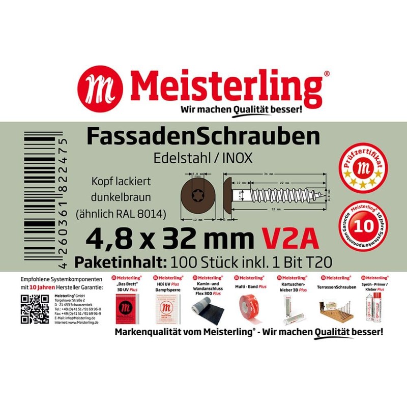 - Meisterling Façade Screws Stainless Steel V2A 4.8 x 32 mm Flat Head Torx T20 Dark Brown Similar to RAL 8014 + 1 Bit Pack of 100