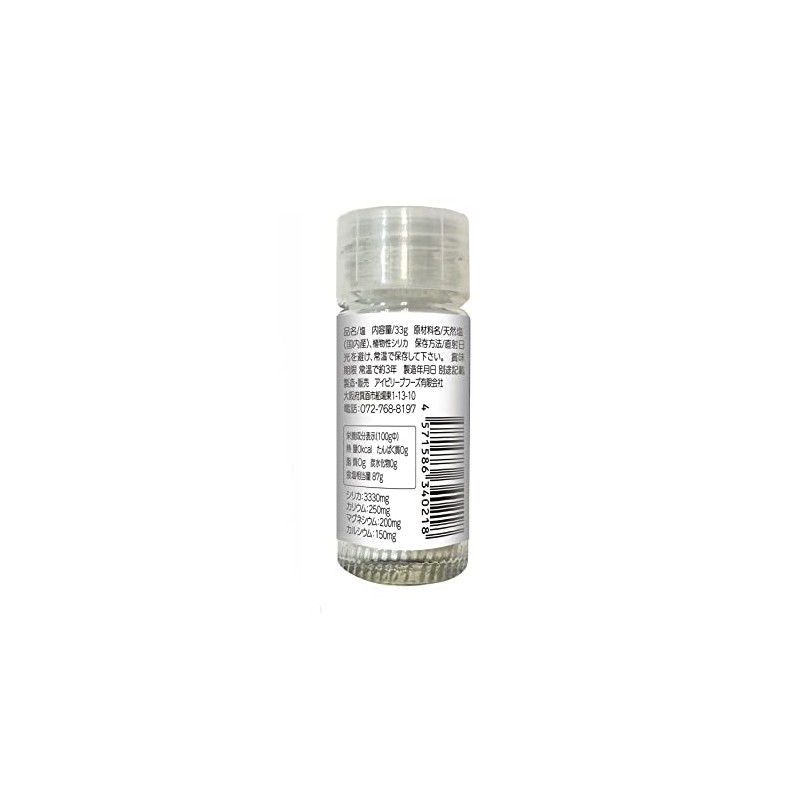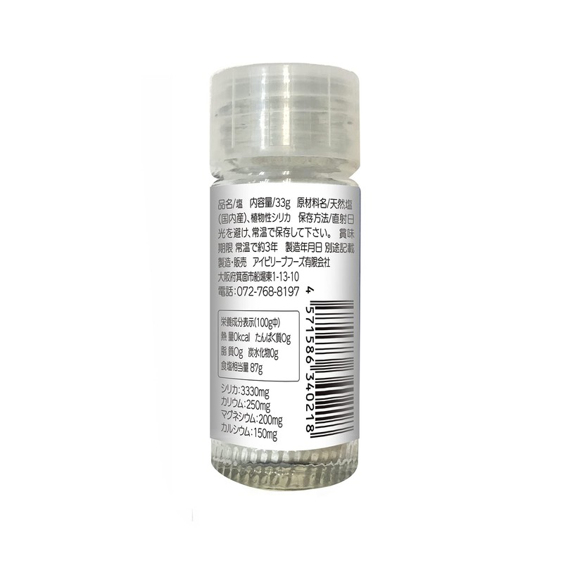 • 品名/塩 内容量/33g 原材料名/天然塩 (国内産)、植物性シリカ 保存栄養成分表示(100g中) 熱 量0kcal たんぱく質Og 脂 質Og 炭水化物0g 食塩相当量 87g
