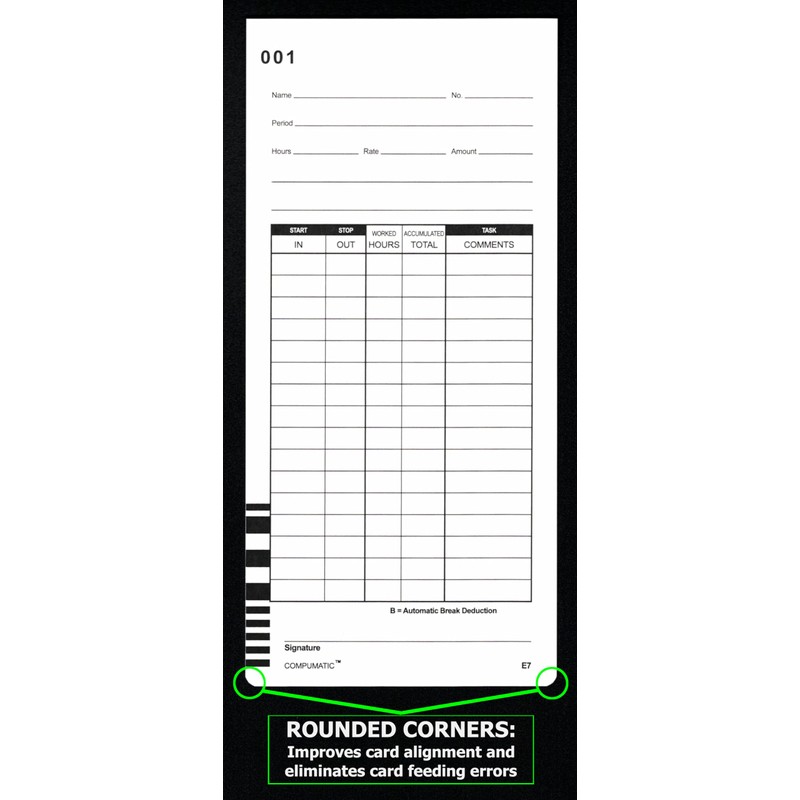 - 10 packs of 100 time cards per pack, Bar coded numbered 1-100 (E7-100)