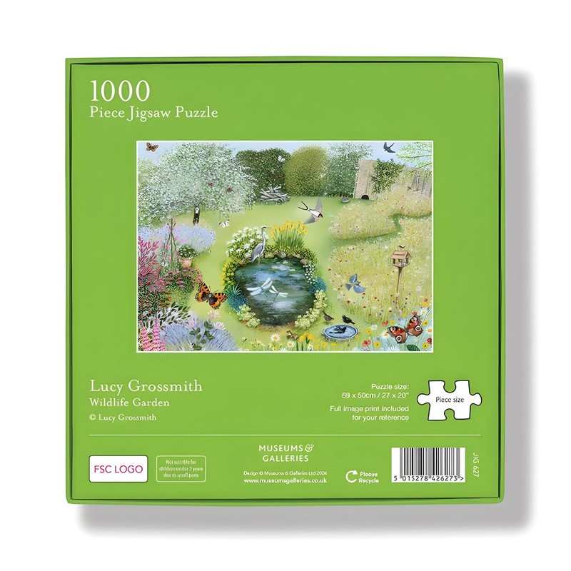 1000 PIECE PUZZLE: An artistic jigsaw puzzle with full image poster included for your reference, from the Coast and Country Range at Museums and Galleries. WILDLIFE GARDEN: This beautiful design has been adapted from artwork by Lucy Grossmith, with a pretty, sunny garden scene featuring British wildlife. PRODUCT MEASURES: 69 x 50 cm (completed puzzle size). ORIGINAL GIFT IDEA: A classic gift, that is ideal for someone special or a loved one who enjoys art or a mindful moment. It is perfect for a birthday, Christmas, or other occasion, and also makes a lovely self purchase as a collector item. MUSEUMS AND GALLERIES: The UK’s leading producer of quality cards, gift stationery and design-led home and giftware.