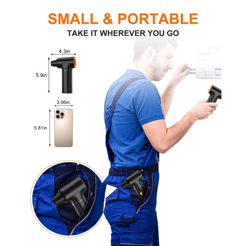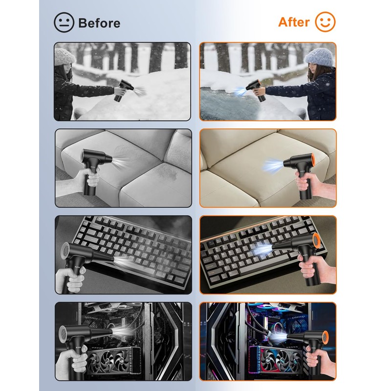 • Super Power Air Duster: YEAHCO 2025 updated electric air duster adopts the speed of 300000 RPM brushless motor, delivering strong wind speed exceeding 120m/s,wind pressure 300G.The powerful wind force can clean up debris and dust on various devices easily. This cleaning tool perfect for a wide range of tasks, like daily dusting, drying, removing car water or snow