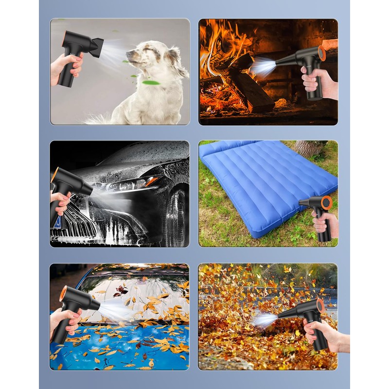 • Wide Application:YEAHCO air blower with 3*Nozzle, 3*Brushes, 1*Storage bag, 1*Type C charging cable. It can clean computers, keyboards, laptops, car seats, and household areas like sofas and tight corners. It also dries pet hair quickly, cleans car interiors, removes car leaf and yard leaves &debris. For outside, can be a mini burner helper for BBQ, inflate an small air cushion