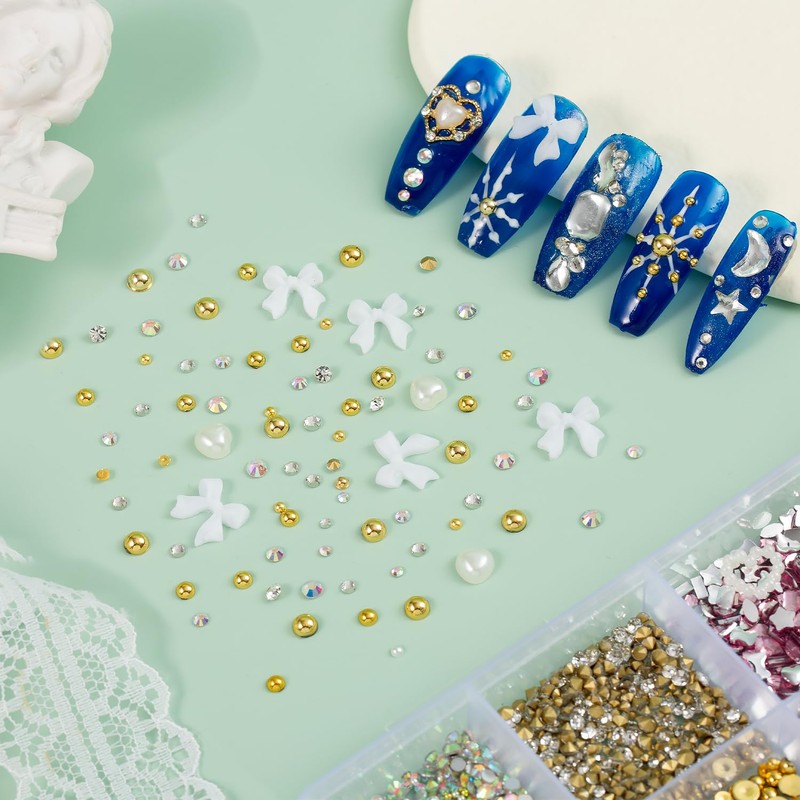 - WORTH YOUR MONEY-- A big box of 3D bow nail charms with pearl nail charms, flatback rhinestones and gems, caviar beads in 15 grids, about 10000 pieces in total. It is a great amount of y2k nail charms for you to make various creative nail designs. Besides with 2 rhinestones picker tools: a tweezer and a wax pencil for picking up your nail art gems.
