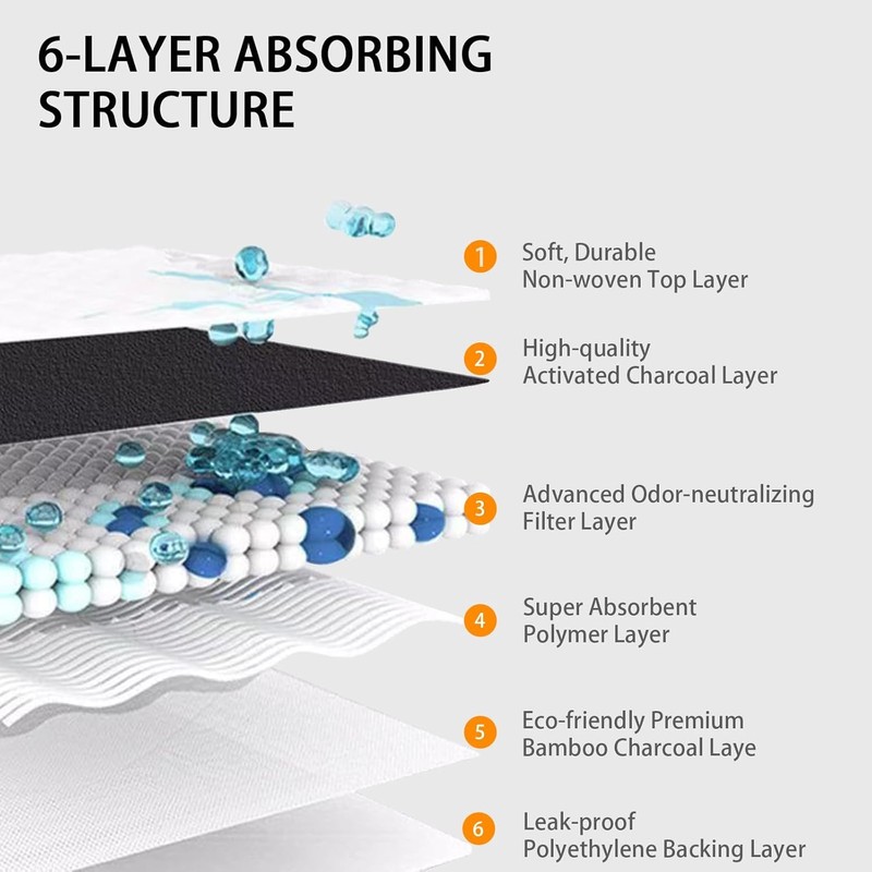 - 【Bamboo charcoal absorbs odors】 Keeping your home fresh and clean. Our Puppy Pee Pads are designed with advanced odor neutralization technology and use activated carbon to effectively eliminate unpleasant odors.