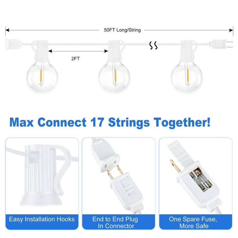 These globe string lights support end to end connection. Unlike other traditional string lights which can only support 2-5 strands, our 50FT G40 globe string lights support multi-connectable up to 17 strands! It can satisfy your different decoration needs for different places.