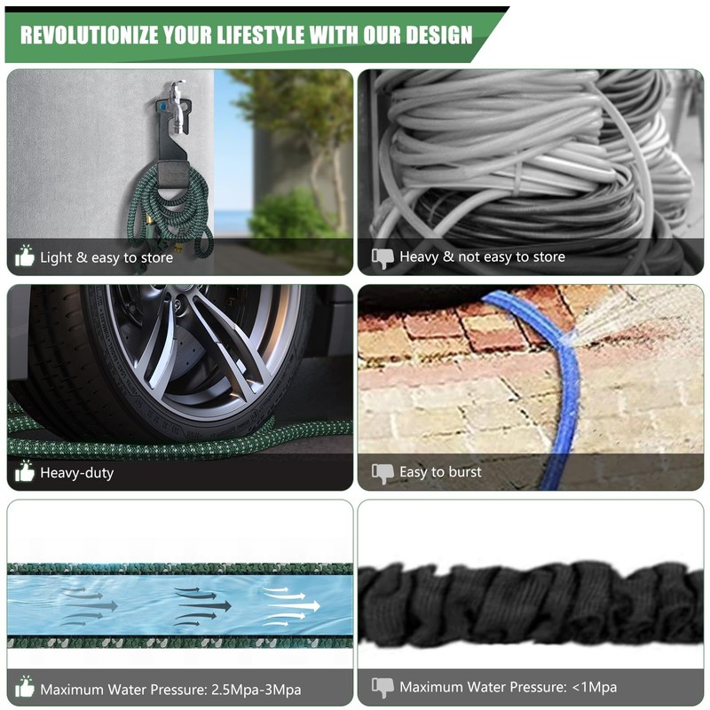 • Easy to Use and Store – The hose is portable and can easily maneuver around obstacles. It's tangle-free, easy to install, and saves storage space. Lightweight and suitable for children, the elderly, and those who can't lift heavy objects. We also provide hose hooks for better storage. It's more lighter, and more than traditional plastic hoses.