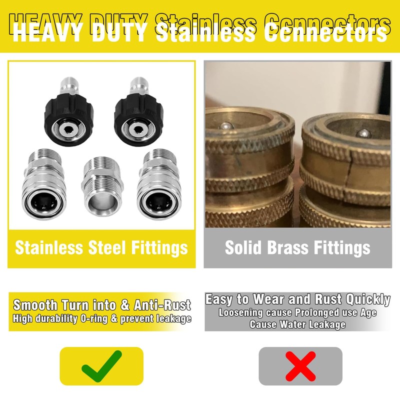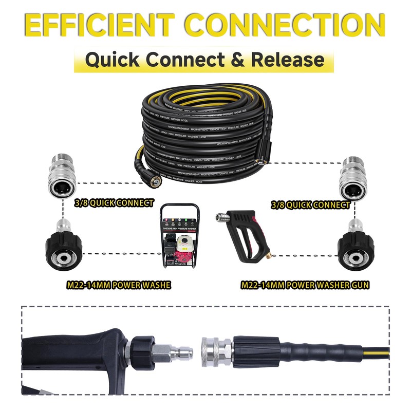 - [Quick Connect & Extension Kit] Includes 5 heavy-duty stainless steel adapters +1 Storage strap with handle ,designed for quick and easy hookup, disconnection, and extension of your pressure washer system. Features a 3/8" quick connect plug and M22 extension coupler for maximum compatibility and flexibility. Perfect for streamlining your setup and improving overall efficiency during cleaning tasks.
