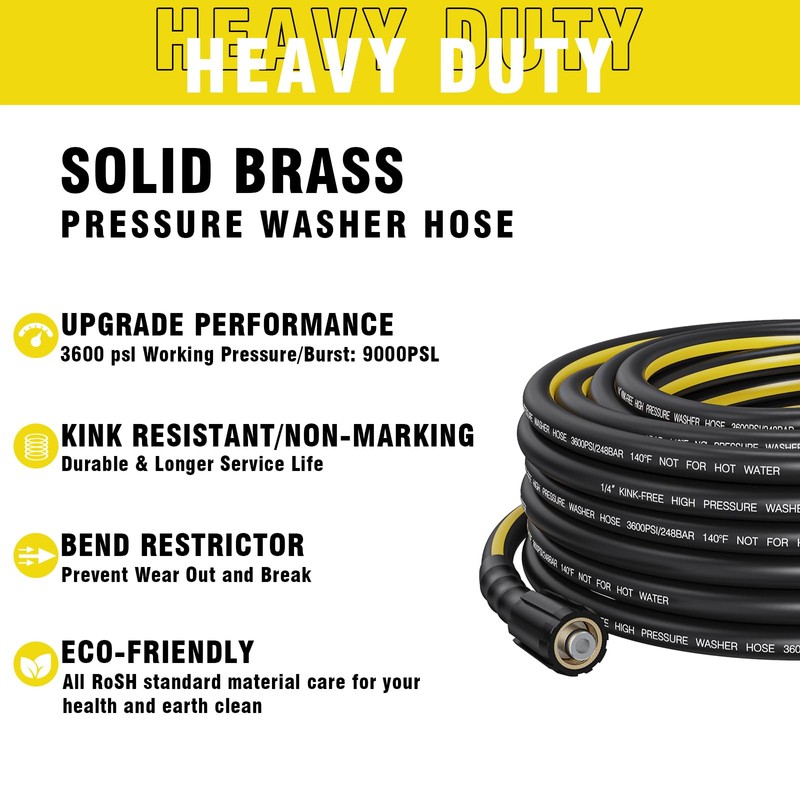 - Upgrade your pressure washing with this 1/4" x 100 ft hose, rated up to 3600 PSI. Built with lightweight yet durable materials, it’s easier to maneuver than standard rubber hoses. The kink-resistant design reduces memory and ensures a smooth water flow, making it ideal for cleaning your car, driveway, patio, or deck. Note: Avoid contact with hot surfaces.