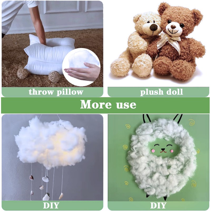 - Stuffing for Stuffed Animals: Polyester fiberfill has good support and full shape, very suitable for various craft projects, such as stuffed animals, pet kennels, pillows, cushions, quilts and so on.