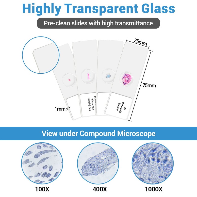 - Professional biological specimens: 100 pieces prepared microscope slides contain human tissue, cells, bacteria, plants, insects and animal samples. Labeling on each slide identifies specimens easily.