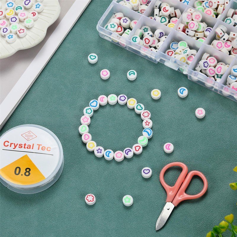 - Package Including: 100pcs 10mm Star Moon Flower Heart polymer clay beads with a roll of elastic string.