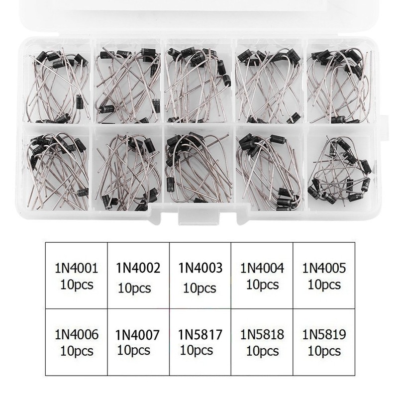- 10 Values: 1N4001, 1N4002, 1N4003, 1N4004, 1N4005, 1N4006, 1N4007, 1N5817, 1N5818, 1N5819
