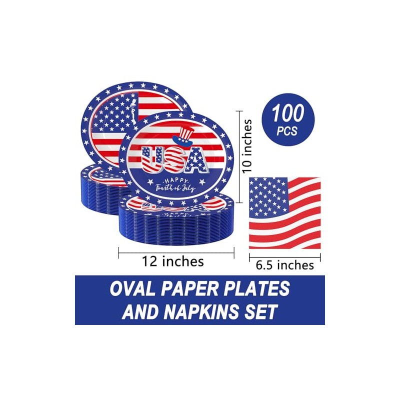 Independence Day Oval Paper Plates and Napkins Set: Package includes 50pcs 10" x 12" oval plates and 50pcs napkins(folded: 6.5*6.5inches)