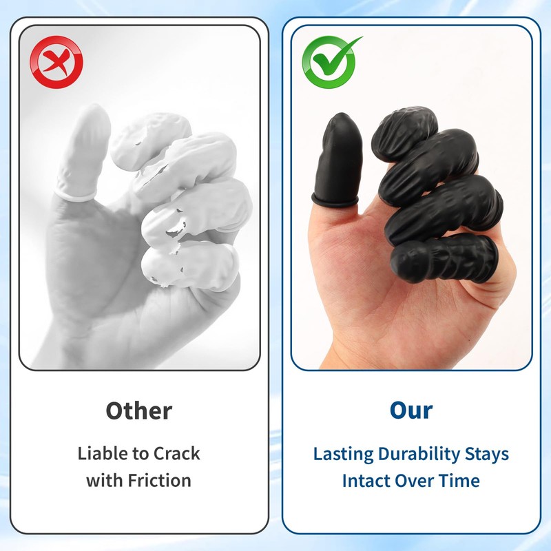 - Flexible Protective Barrier for Multiple Uses: Made from stretchable nitrile material, these finger cots provide a snug fit while allowing full finger movement. The textured surface improves grip when handling small items like jewelry components or electronic parts. Unlike latex options, these won't tear easily during extended tasks and leave no residue when removed.
