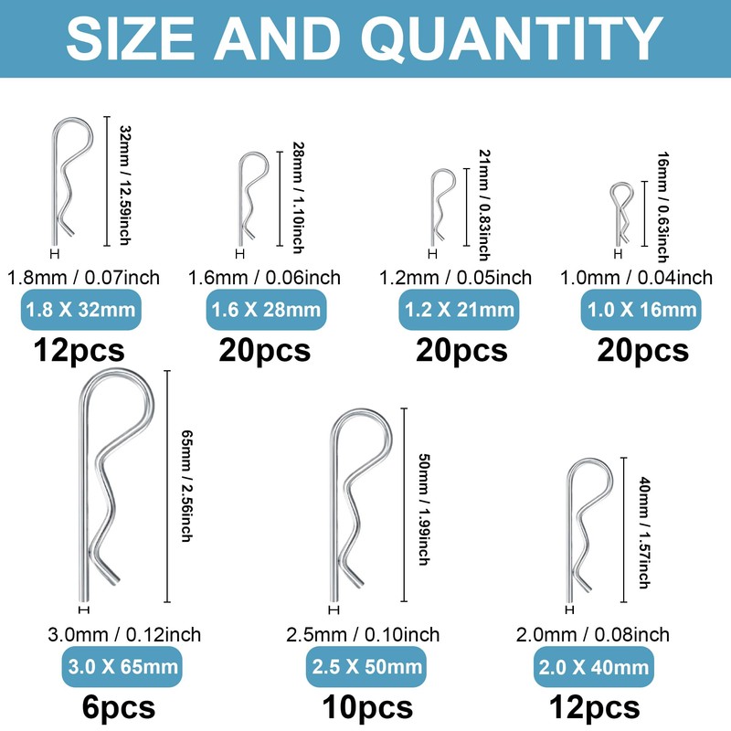 - Package Includes: You’ll receive 120 cotter pins in a portable plastic box, featuring various sizes: 4 X 60mm(10pcs), 3.2 X 40mm(10pcs), 3.2 X 30mm(15pcs), 2.5 X 25mm(15pcs), 2.5 X 30mm(10pcs), 2.5 X 40mm(30pcs), 1.6 X 25mm(30pcs)