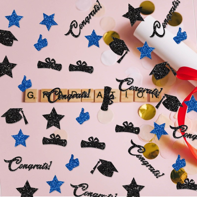 100Pcs Graduation Party Confetti, Gold Black Glitter Graduation Confetti Congrats Diploma Grad Cap Star for 2025 Graduate Party Decorations Supplies (Blue)