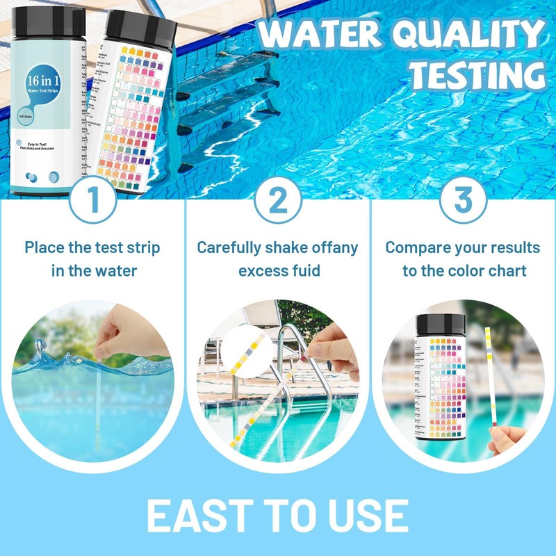- Upgraded 16 IN 1: A new upgraded ph strip,16 IN 1, which contains 16 test parameters, including all the major contaminants of concern, including total hardness, free chlorine, total chlorine, bromine, total alkalinity, pH, nitrate, nitrite, copper, iron, lead, nickel, carbonate, MPS, cyanuric acid, sulfite.