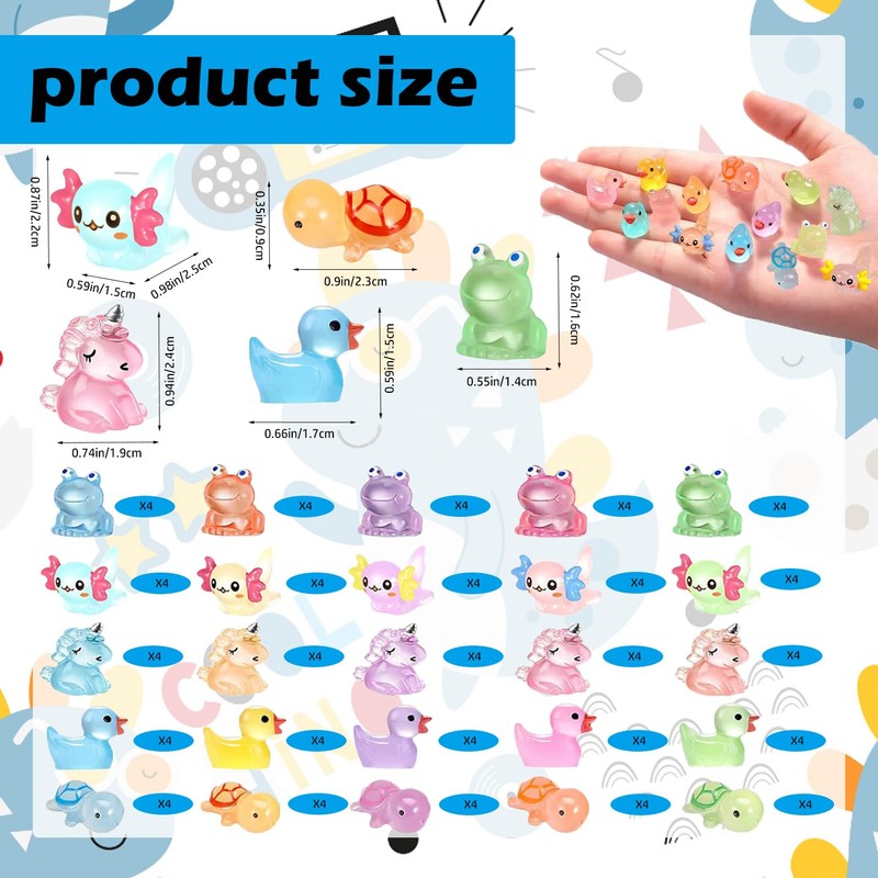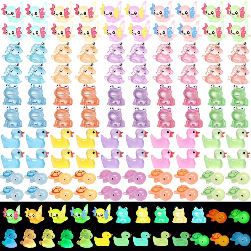 - Package Include: You will receive 100 pieces of glow resin animals,Include 20 luminous little ducks in 5 colors, 20 luminous turtles in 5 colors, 20 luminous unicorn in 5 colors, 20 luminous frog in 5 colors,and 20 luminous Axolotl in 5 colors. 5 product combinations come in matching sets. Tiny animals figures the quantity is enough to meet your diverse needs