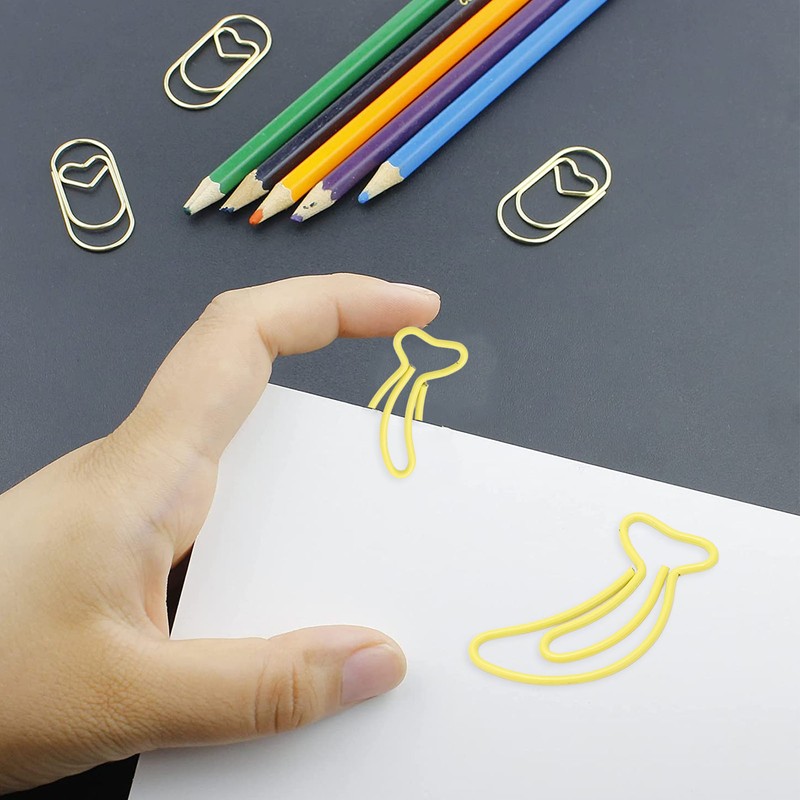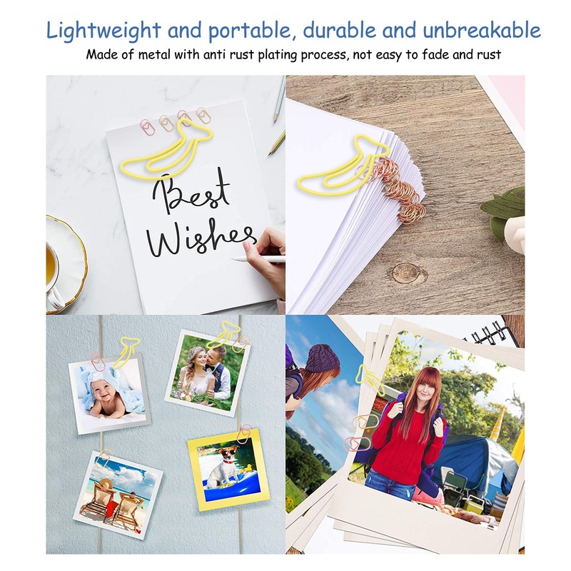 1、Lightweight and Portable: The paper clip is light and portable, durable and not easy to break, long term use, suitable for document classification. 2、Metal Material: It is made of metal material and adopts anti rust electroplating process, which is not easy to fade and rust. 3、Practical And Reliable: Not easy to damage paper, increase slip resistance, can be used as bookmarks, etc. 4、Exquisite Appearance: The use of lovely banana shape, beautiful color, the clip has a bright, corrosion resistant surface. 5、Scope of Application: Can help organize your documents and drawing paper for office, home and everyday use.