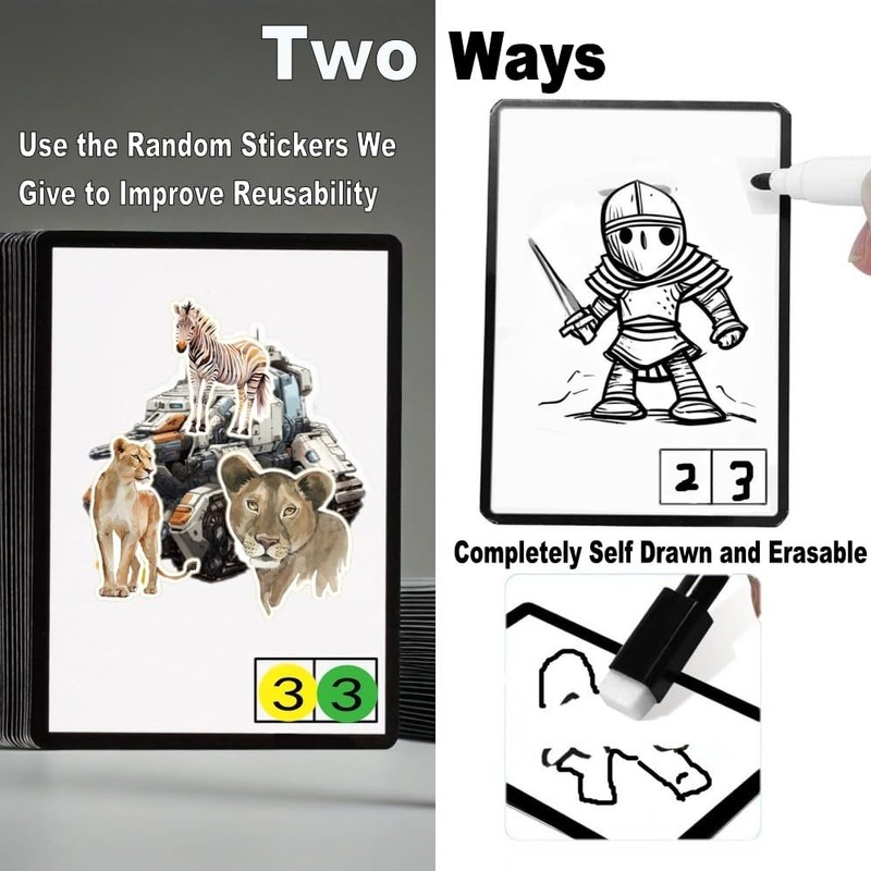 - 【More Like Game Cards】: Unified background cover on the back of the card.One side of the cards can be written on and erased, and can be used repeatedly, markers comes with its own brush.