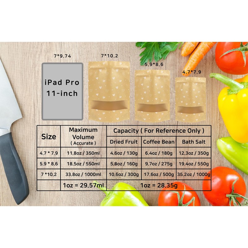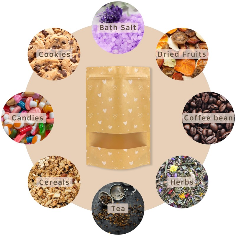 100PCS Stand Up Pouch bag with Window, Kraft Ziplock, 7"x 10.2", Reusable, Resealable & Heat Sealable, Food Grade, Great for Valentine's Day Gift, Small Business