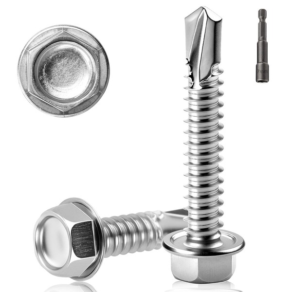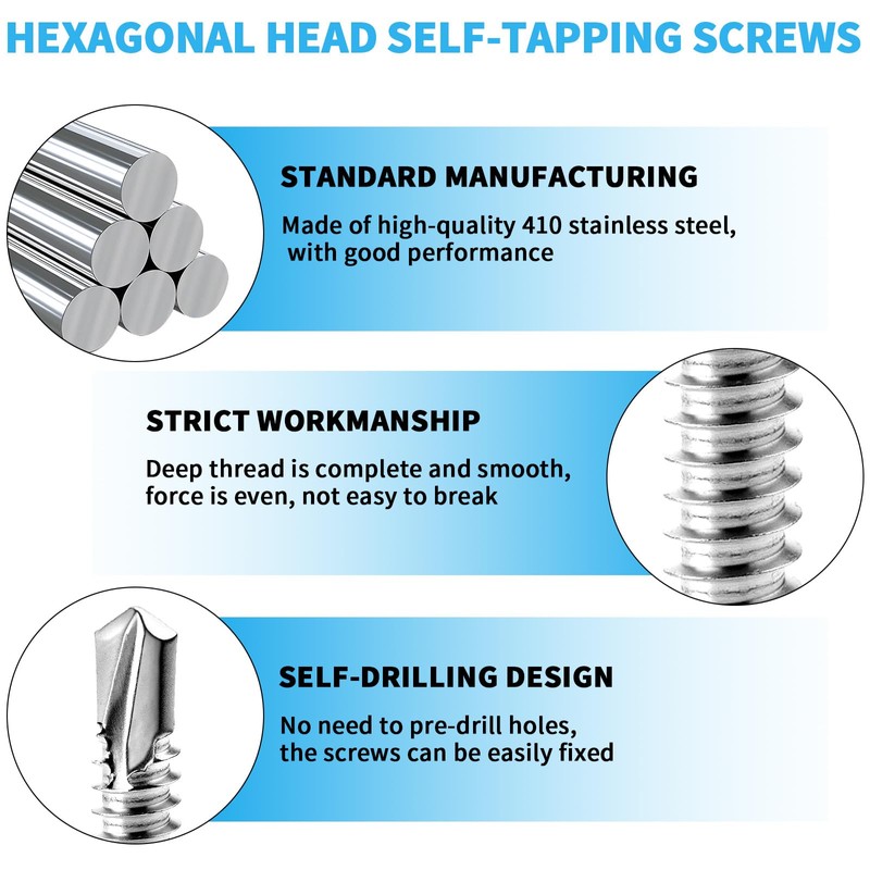 - 【Easy to Install】Self drilling screws for metal features a deep thread design, ensuring strong penetration and fastening power in different materials, achieving secure connections. Each hexagon-head self drilling screws is designed with a special tail, eliminating the need for pre-drilling, making installation quick and easy. Stainless steel screws can be directly driven into metal, wood, plastic, and other materials, making it an ideal fastening solution.