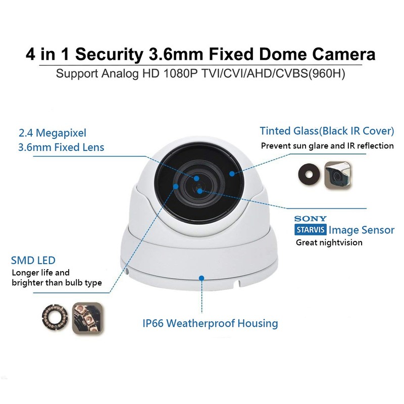 - 4 IN 1 HD-TVI, HD-AHD, HD-CVI, CVBS(700TVL) HD technology produces 1080P Full-HD Video with Sharp and Detailed Images