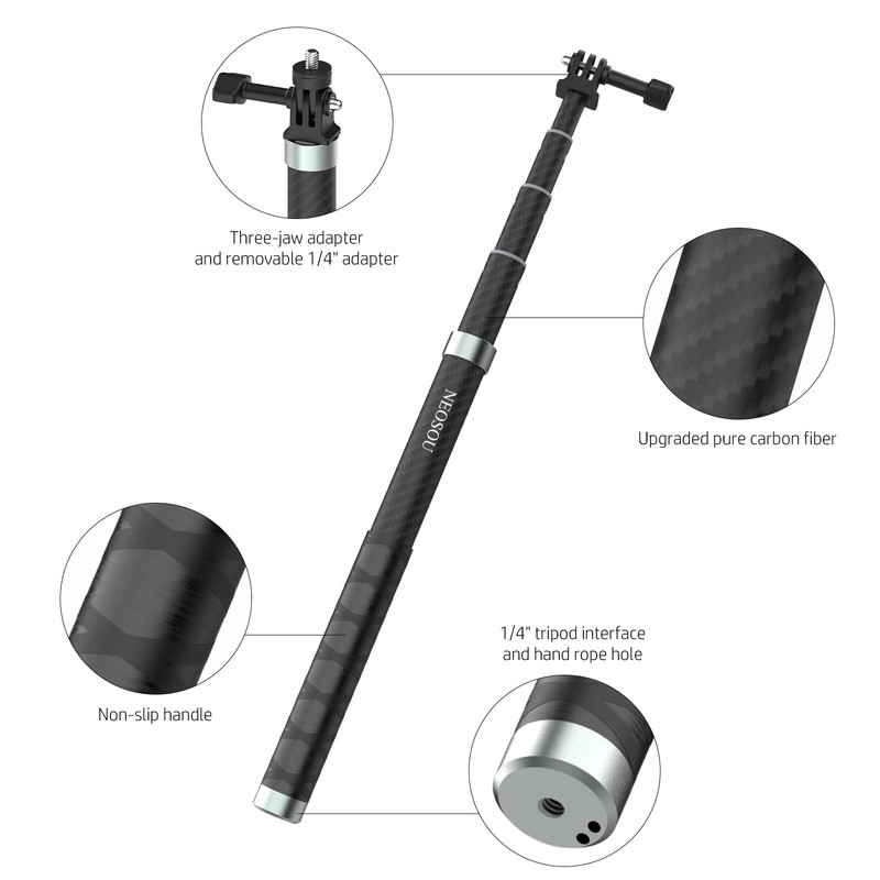 • 【Upgraded Pure Carbon Fiber Made】 NEOSOU’s 260cm/102-inch ultra long selfie pole newly made of full pure carbon fiber material which combines high strength and toughness, better performance in waterproof and rustproof, possible to use in rain, snowboarding and sea water surfing condition.