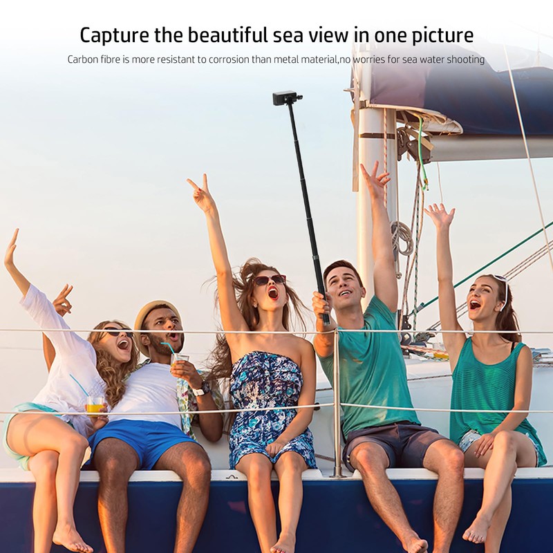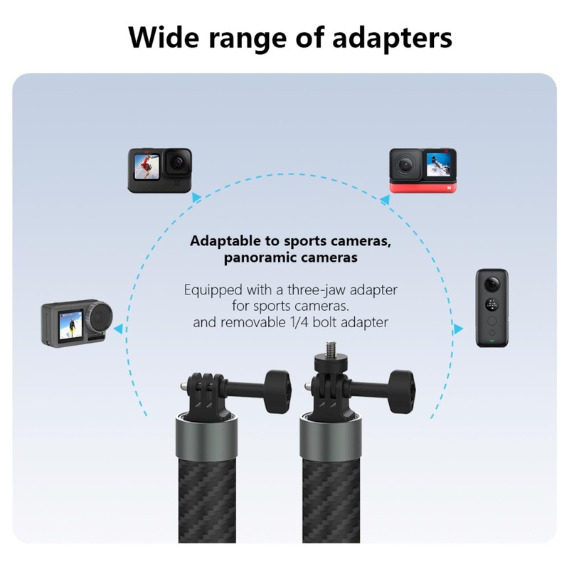 Compatible for GOPRO HERO 13 12 11 10 9 8 7 6 5 series, DJI Action 5/4/3, Osmo Pocket 3, Insta360 X4/X3/GO 3S/Ace Pro 2, and more sport wearable camera. Weighing just 9.88oz/280g, this ultra-light carbon fiber pole stretches from 16.93" to 102.36" in seconds, surviving well in rain, snow, and saltwater condition.