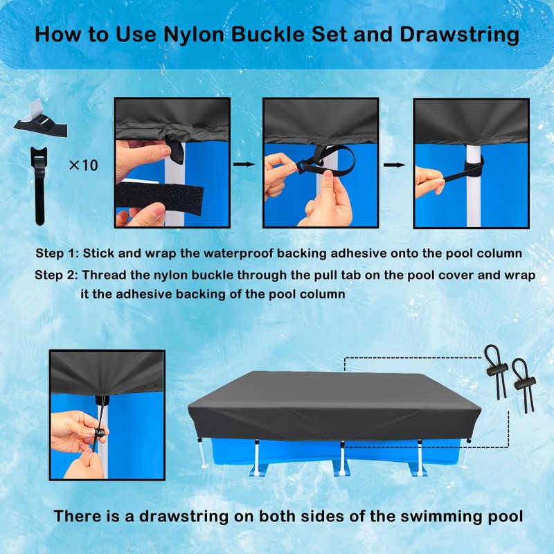 - 【Secure & Strong wind resistance】Our rectangular swimming pool cover is equipped with adjustable drawstrings and a 10 nylon buckle set, enhancing the stability of the pool cover and withstanding strong winds and harsh weather, providing perfect protection for your swimming pool.