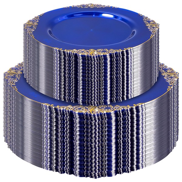 102pcs Blue Plastic Plates with Gold Rim, Disposable Party Plates, Include 51pcs 10.25inch Dinner Plates, 51pcs 7.5inch Dessert Plates, Table Decorations for Wedding Birthday Christmas Parties