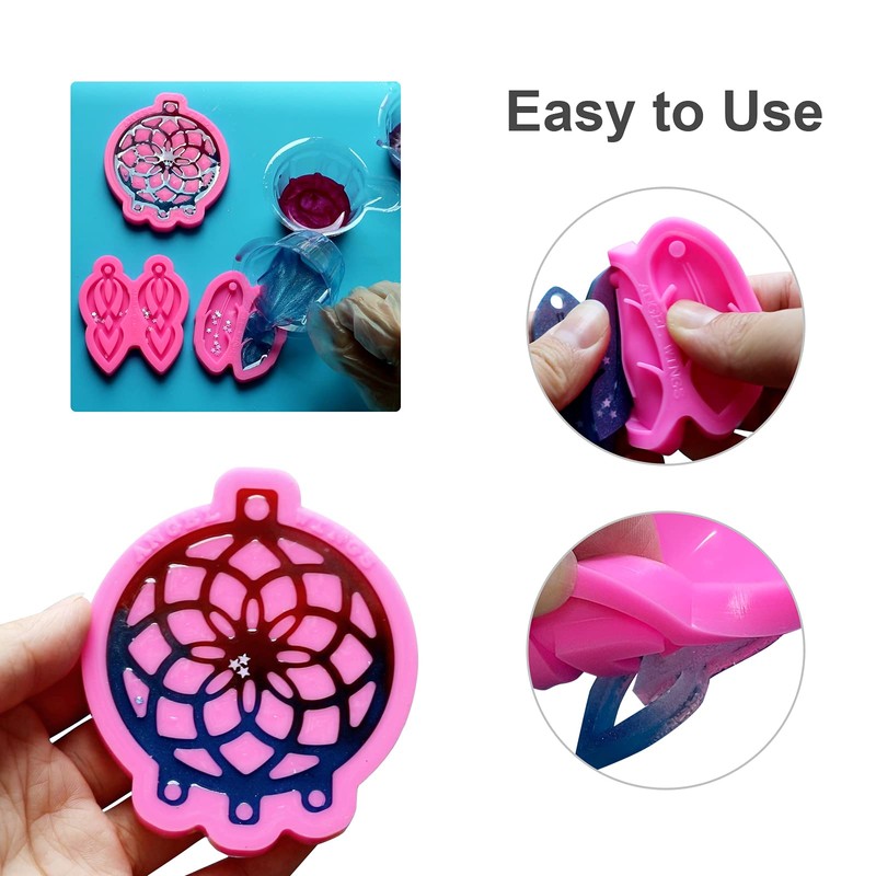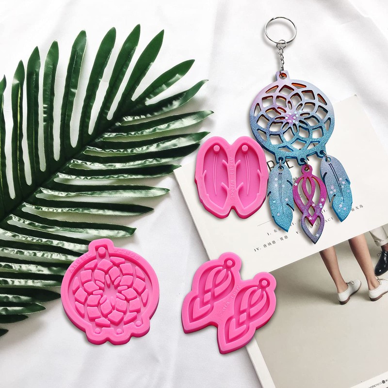 - 【PACKAGE CONTENT】 You will get 3 pieces of silicone molds in 3 different styles including dream catcher/feather/retro hollowout shape mold, 10pcs key rings with chain, 20pcs 6mm open jump rings, 40pcs 8mm open jump rings, 10pcs silver earring hooks and 20pcs clear silicone earring backs stoppers.