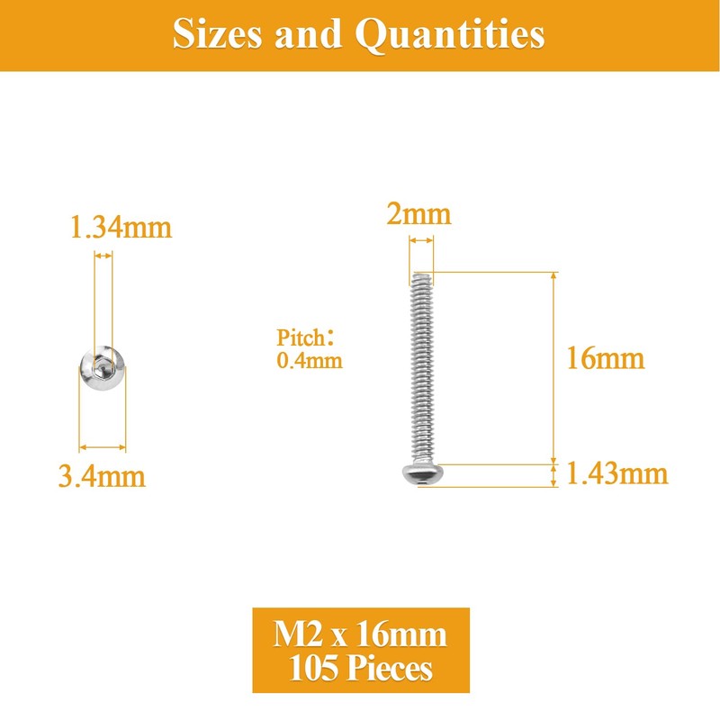 - √ Dimension: Total 105 pieces M2x16mm silver button head socket cap screws, thread diameter: 2mm, thread length: 16mm, thread pitch: 0.4mm, enough quantities can meet your different daily needs.