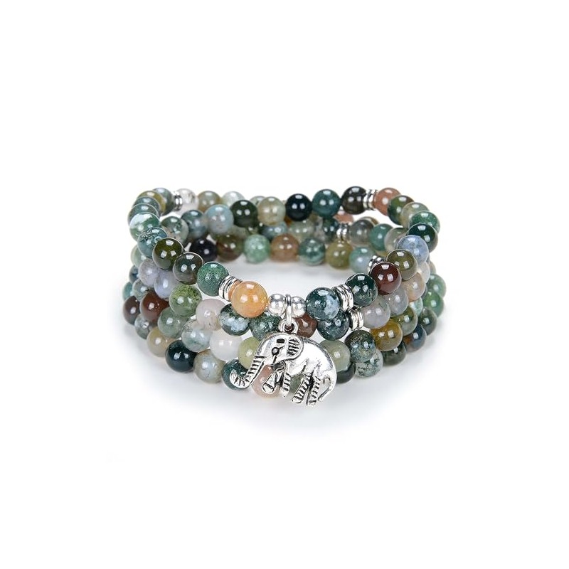 108 Mala Beads Tiny Elephant Lucky Charm Wrap Bracelet Necklace Self Discovery Yoga Inspirational Jewellery (Indian Agate)