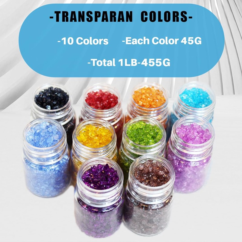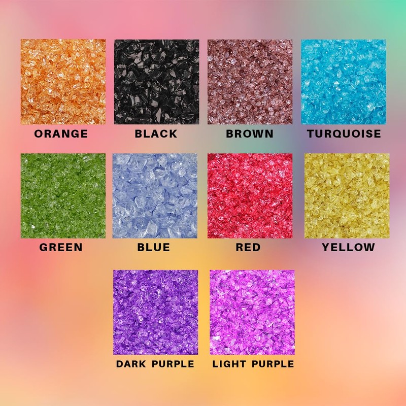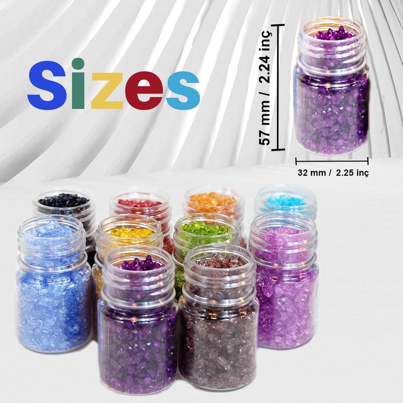 - 10 Colors Crushed Glass: Each jar in 10 different colors is 1.58oz/45grams total change of 1LB-455GR. Their sizes range from 1-3mm. In this way, you can use it in many of your works. Orange-Black-Brown-Turquoise-Green-Blue-Red-Yellow-Dark Purple-Light Purple depends. You can meet your needs by purchasing the product with these metallic colors. It is a good choice for handmade products.