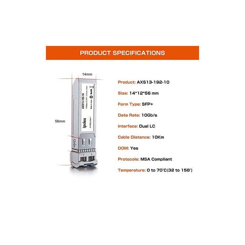 - 10Gb/s, 10GBase-LR SFP+ transceiver, 1310-nm, dual LC connectors, range up to 10 km transmission via single-mode fibre.